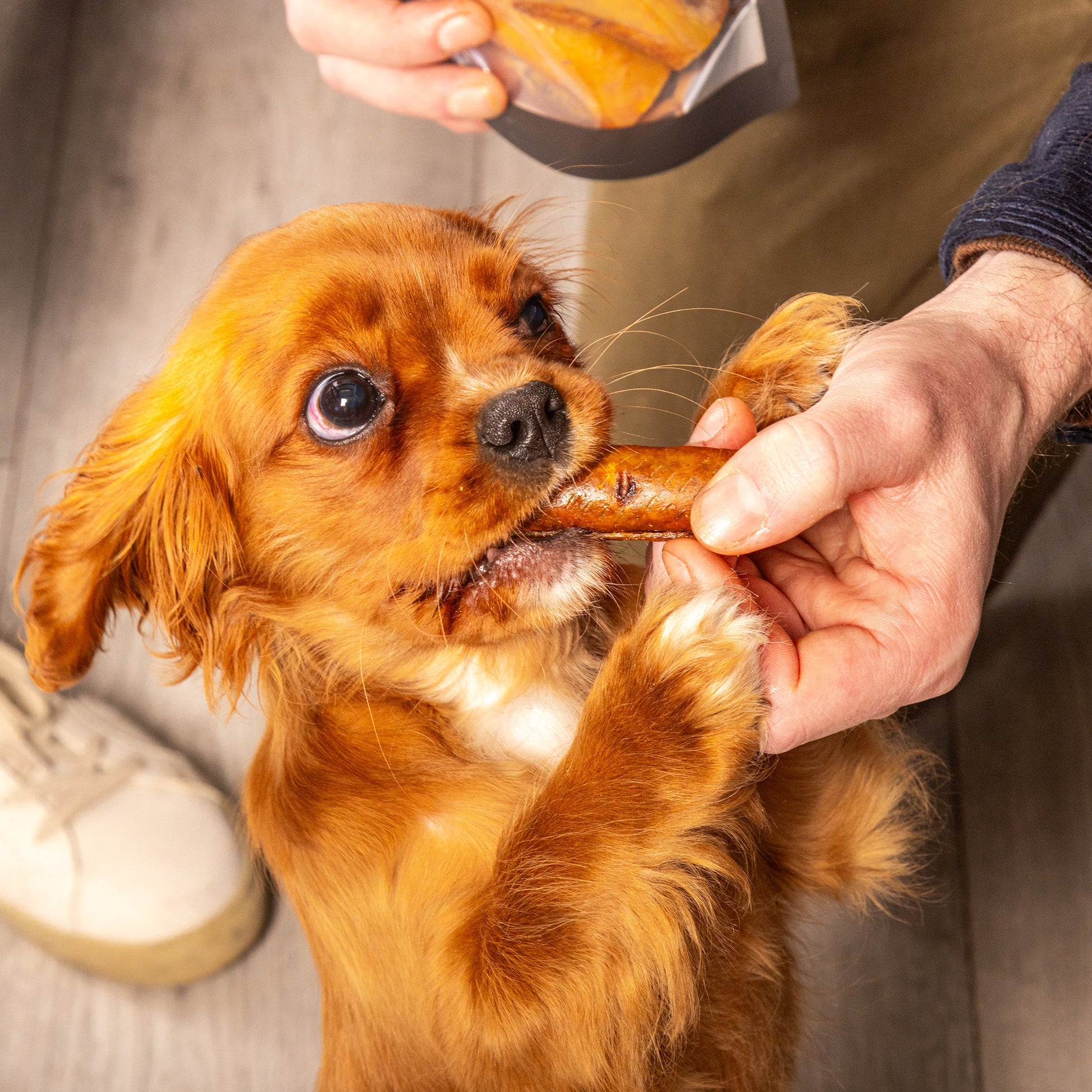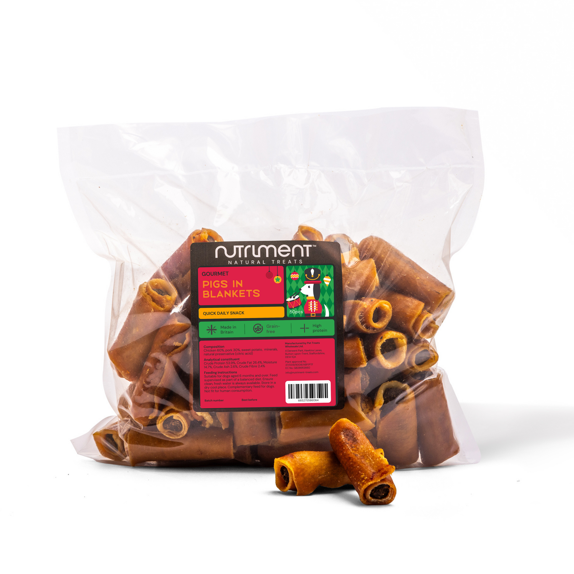 Our gourmet chicken sausages, wrapped in pork rind, these delicious Pigs in Blankets are loved by dogs of all shapes and sizes. They are slow roasted in their own juices to ensure mouth watering taste in every bite!