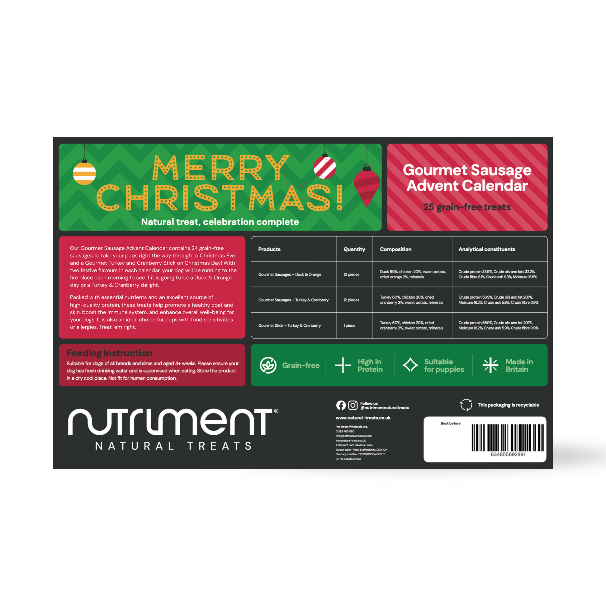 Our 2025 Gourmet Sausage Advent Calendarcontains 24 grain-free sausages to take your pups right the way through to Christmas Eve and a Gourmet Turkey and Cranberry Stick on Christmas Day! With two festive flavours in each calendar, your dog will be running to the fire place each morning. Packed with essential nutrients and an excellent source of high-quality protein, this treat helps promote a healthy coat and skin, boosts the immune system and enhances overall well-being for your dogs. It is also an ideal choice for pups with food sensitivities or allergies.